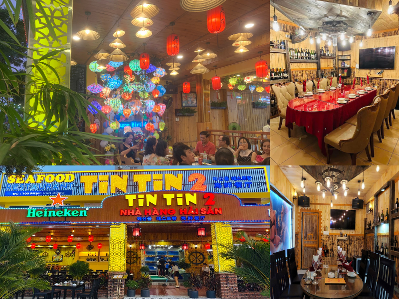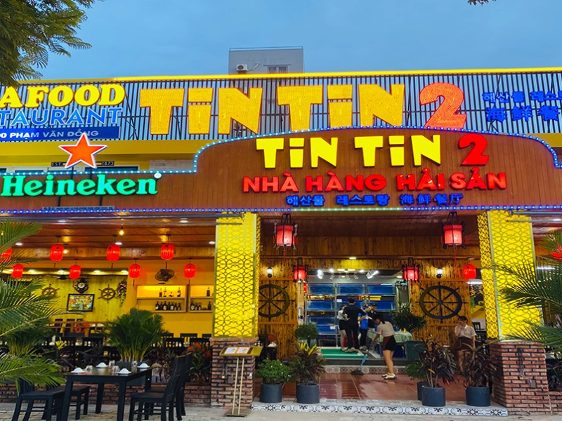 Nhà hàng Tin Tin là địa điểm được nhiều khách du lịch tin tưởng và tới thưởng thức với lý do hải sản tươi sống, mọi thực phẩm đều có thể lựa chọn và bắt ngay tại bể, Không gian nhà hàng thiết kế đậm chất Đà Nẵng và Hội An khi được trang trí lòng đèn và gỗ.